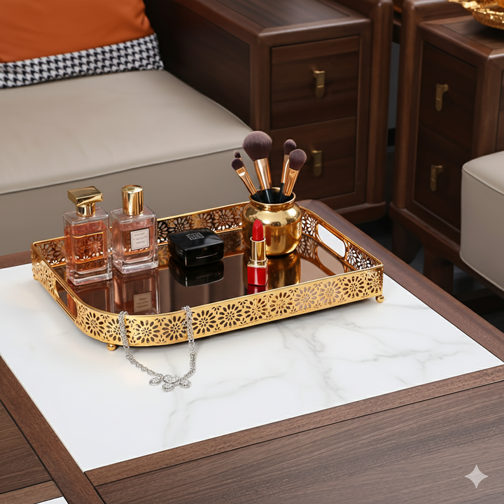The trays feature a striking gold finish, a reflective mirrored base, and a delicate filigree (cut-out) design along the edges, instantly elevating your beauty collection.